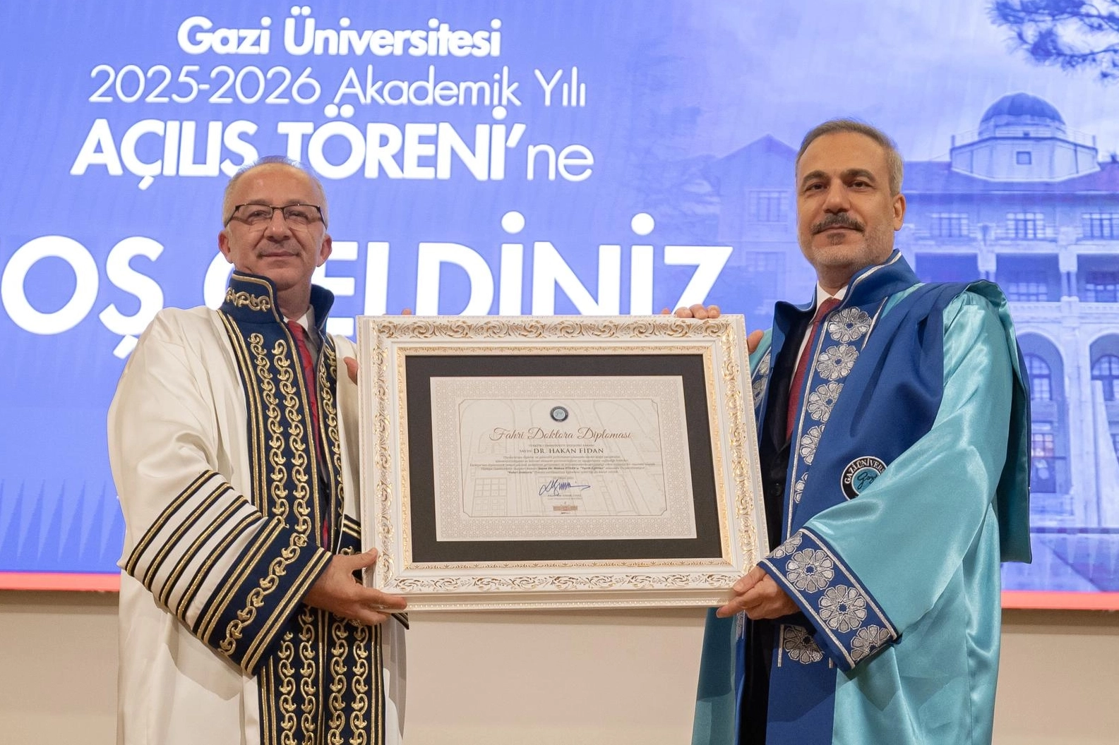 Dışişleri Bakanı Hakan Fidan, Gazi Üniversitesi'nin 2025-2026 Akademik Yılı açılış törenine katıldı. Gazi Üniversitesi tarafından Bakan Fidan’a ‘Tarih’ alanında fahri doktor unvanı verildi. Fidan, cübbe giyerek diplomasını teslim aldı. Fidan, "Gazi Üniversitesi, Türkiye'nin fikir dünyasına, kamu yönetimine ve diplomasi kültürüne de bir nevi kaynaklık eden önemli akademik kuruluşlarımızdan biri olmuştur. Bugün böylesine derin bir tarihe ve ilmi geleneğe sahip bir üniversiteden fahri doktora unvanı almak benim için, ifade ettim, ayrıca bir onur kaynağıdır" dedi.
