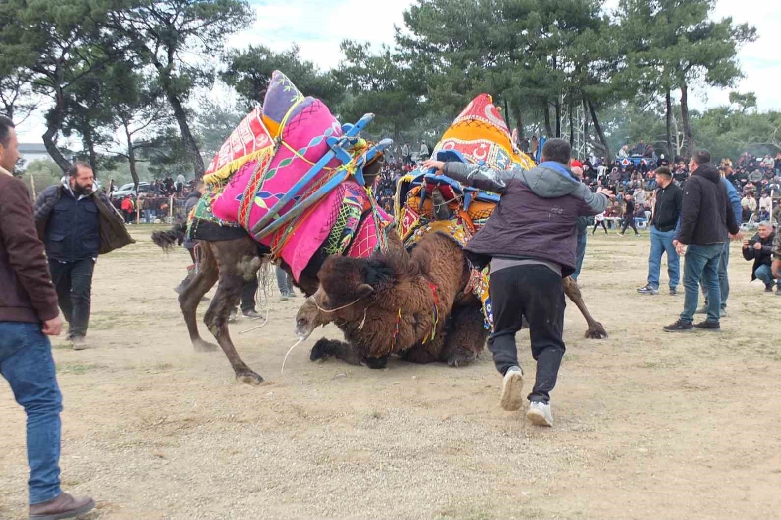 Şap hastalığı nedeniyle iptal edilen deve güreşleri yerine Burhaniye'de düzenlenen ücretsiz antrenman müsabakaları iki bin kişiyi buluşturdu.