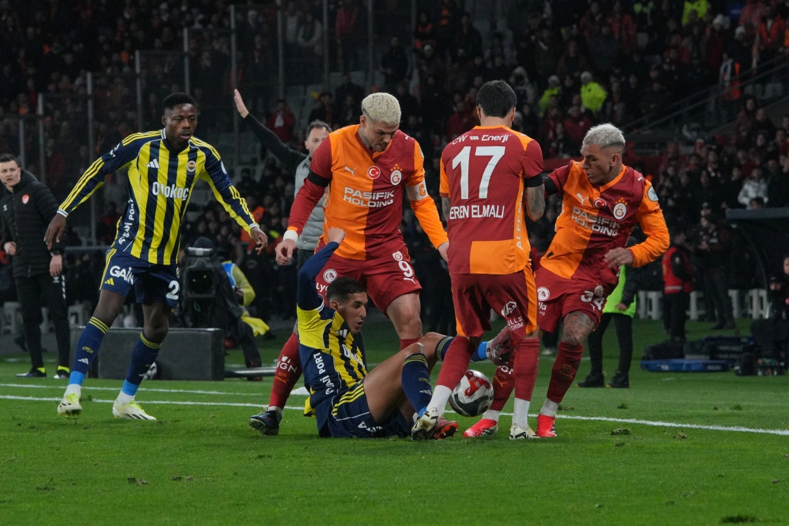 Karşılaşmaya baskılı başlayan Fenerbahçe, oyunun ilk bölümlerinde topa daha fazla sahip oldu. Sarı-lacivertliler, özellikle orta saha üstünlüğüyle Galatasaray kalesinde etkili pozisyonlar üretirken, sarı-kırmızılı ekip hücumda organize olmakta zorlandı. Fenerbahçe, aradığı golü 28’inci dakikada Matteo Guendouzi’nin kaydettiği golle buldu ve soyunma odasına 1-0 önde gitti.