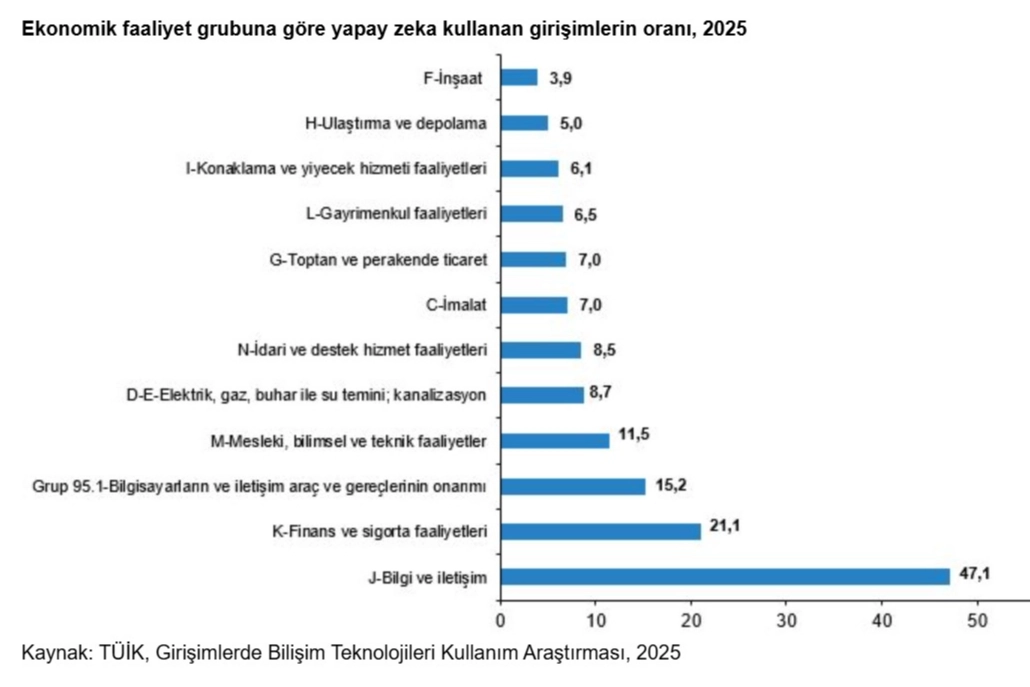 TÜİK, 'Yapay Zeka İstatistikleri-2025' bültenini yayımladı. Buna göre; yapay zeka teknolojilerinden herhangi birini kullandığını belirten girişimlerin oranı, 2021 yılında yüzde 2,7 iken, bu oran 2025 yılında yüzde 7,5 oldu. Yapay zeka kullanan girişimler çalışan sayısı büyüklük grubuna göre incelendiğinde; 2025 yılında 10-49 çalışanı olan girişimlerin yüzde 6,6'sının, 50-249 çalışanı olan girişimlerin yüzde 9,6'sının ve 250 ve üzeri çalışanı olan girişimlerin yüzde 24,1'inin herhangi bir yapay zeka teknolojisi kullandığı görüldü. Bu oranlar, 2021 yılında 10-49 çalışanı olan girişimlerde yüzde 2,3, 50-249 çalışanı olan girişimlerde yüzde 3,6 ve 250 ve üzeri çalışanı olan girişimlerde yüzde 9,6 idi. Yapay zeka teknolojilerinden herhangi birini kullandığını belirten girişimler ekonomik faaliyet grubuna göre incelendiğinde; yapay zekanın en fazla yüzde 47,1 ile 'bilgi ve iletişim' faaliyeti yürüten girişimler tarafından kullanıldığı görüldü. Bu ekonomik faaliyet grubunu yüzde 21,1 ile 'finans ve sigorta' faaliyeti yürüten girişimler ve yüzde 15,2 ile 'bilgisayarların ve iletişim araç ve gereçlerinin onarımı' faaliyetini yürüten girişimler izledi.
