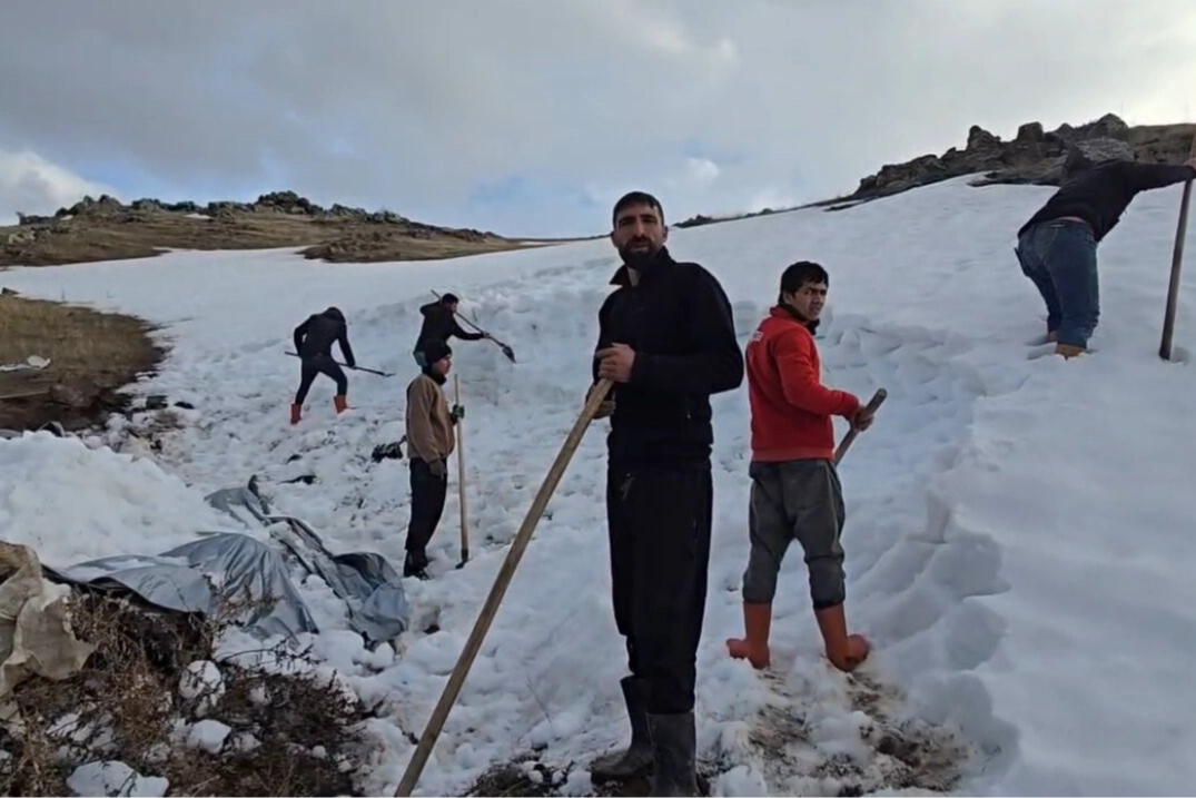 Iğdır'ın Bulakbaşı köyündeki besiciler, su sıkıntısı çekilen yüksek rakımlı yaylalardaki hayvanları için derin çukurlara naylon serip kar depolayarak tamamen pratik, maliyetsiz ve doğayla uyumlu bir çözüm üretiyor.