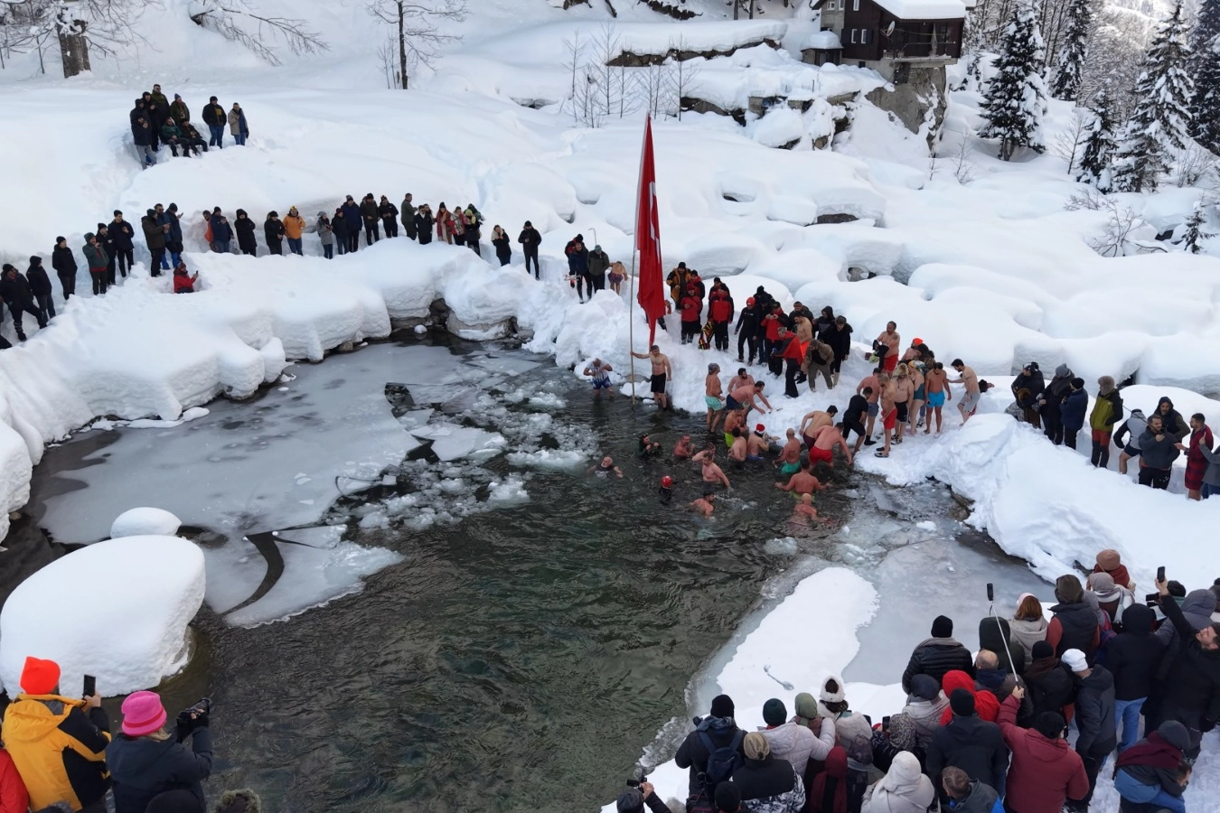 Rize’nin Ardeşen ilçesinde termometreler eksiyi gösterirken, Kaçkar Dağları’nın eteklerinde "iç titreten" ama bir o kadar da eğlenceli anlar yaşandı. "Bize her yer yaz" diyen 60 çılgın yüzücü, kar yağışı altında kısmen buz tutmuş göle balıklama daldı. Sudan çıkanlar ise titremek yerine horon tepti.