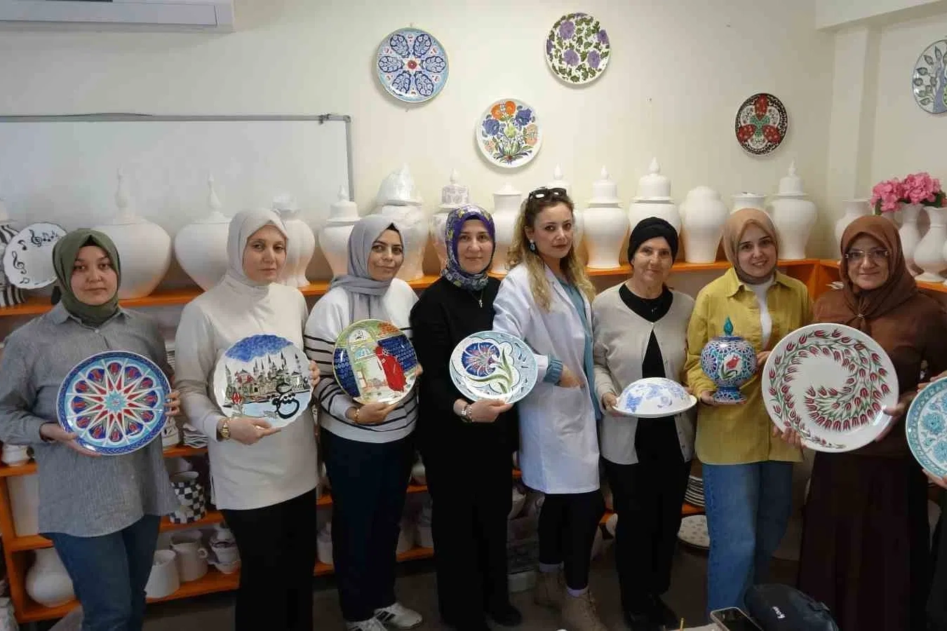 Seramikten yaptıkları kahve fincanları, tabaklar, tablolar ve hediyelik plaketleri büyük bir sabırla boyayarak sanatsal eserlere dönüştüren kadınlar, bu geleneksel sanatı yaşatmanın gururunu yaşıyor.