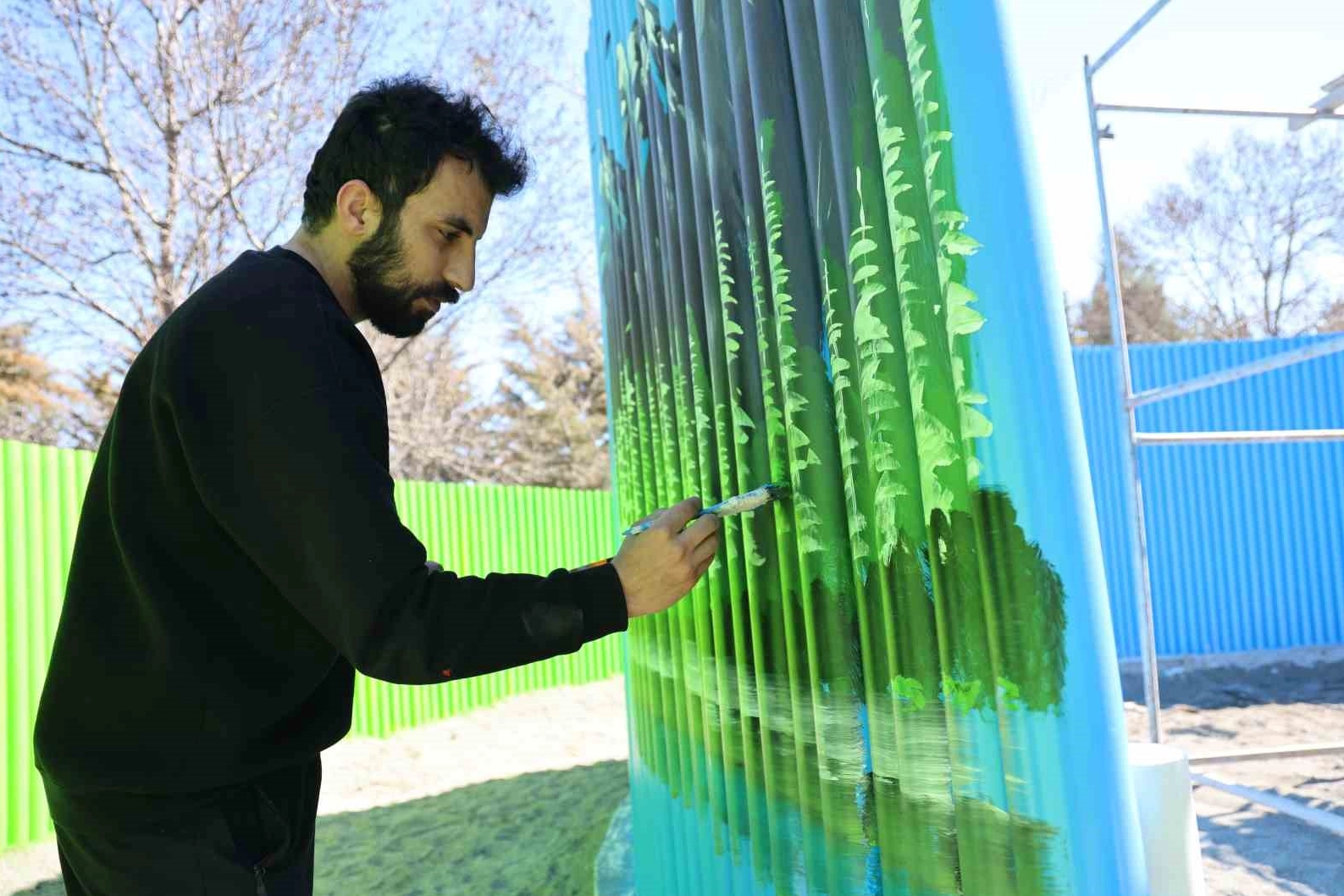 Projede gönüllü olarak çalışan ressam Yunus Gündem ve arkadaşları da ileri dönüşüm malzemelerinden oluşturulan alanları renklendirerek çocuklar için daha eğlenceli bir ortam hazırlıyor.