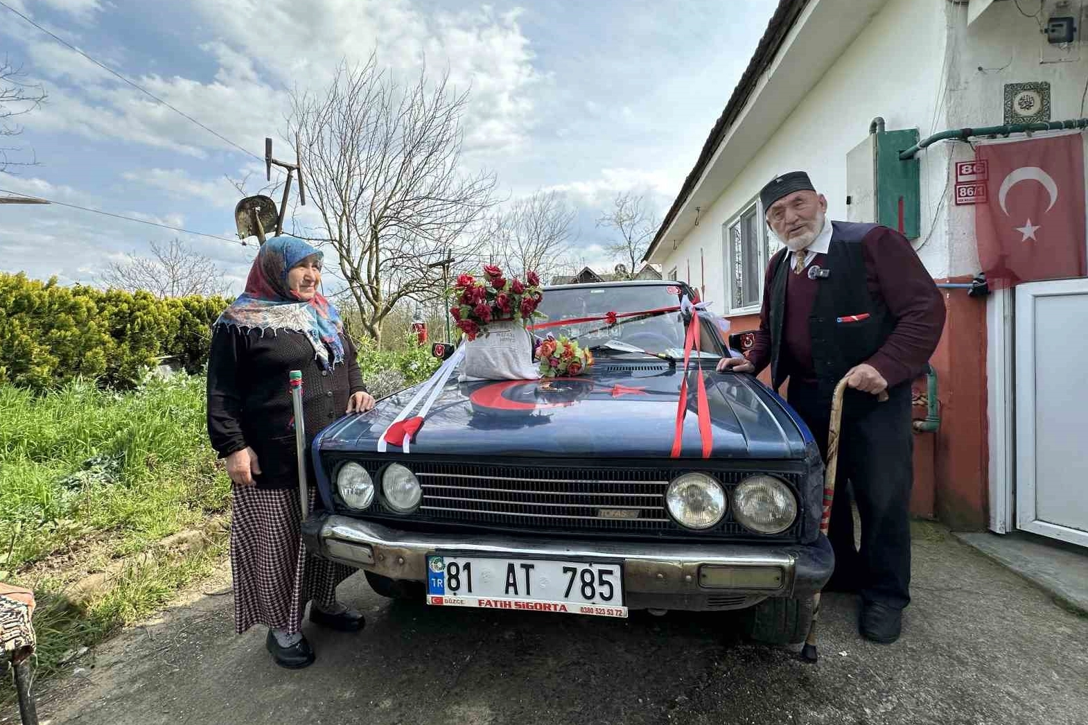 Düzce'de 86 yaşındaki Adem Karagülle, 55 yıllık hayat arkadaşına gelin arabası süsleyip kendi yazdığı aşk şiirini okuyarak sürpriz yaptı.