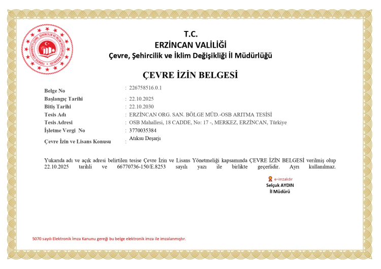 Alınan belge ile birlikte, Erzincan OSB Atıksu Arıtma Tesisi’nin çevre mevzuatına uygun şekilde işletildiği, alıcı ortama yapılan deşarjların yasal sınırlar içerisinde kontrol altında tutulduğu ve çevresel etkilerin düzenli olarak izlendiği resmiyet kazandı.