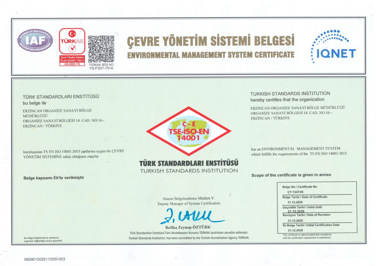 ISO 14001 Çevre Yönetim Sistemi standardı; faaliyetlerden kaynaklanan çevresel etkilerin belirlenmesi, atık yönetimi süreçlerinin iyileştirilmesi, çevre mevzuatına uyumun sağlanması ve çevre risklerinin kontrol altına alınmasını esas alıyor. Bu kapsamda Erzincan OSB’de çevresel boyutlar sistematik olarak ele alınırken, çevre performansını geliştirmeye yönelik uygulamalar hayata geçirildi.