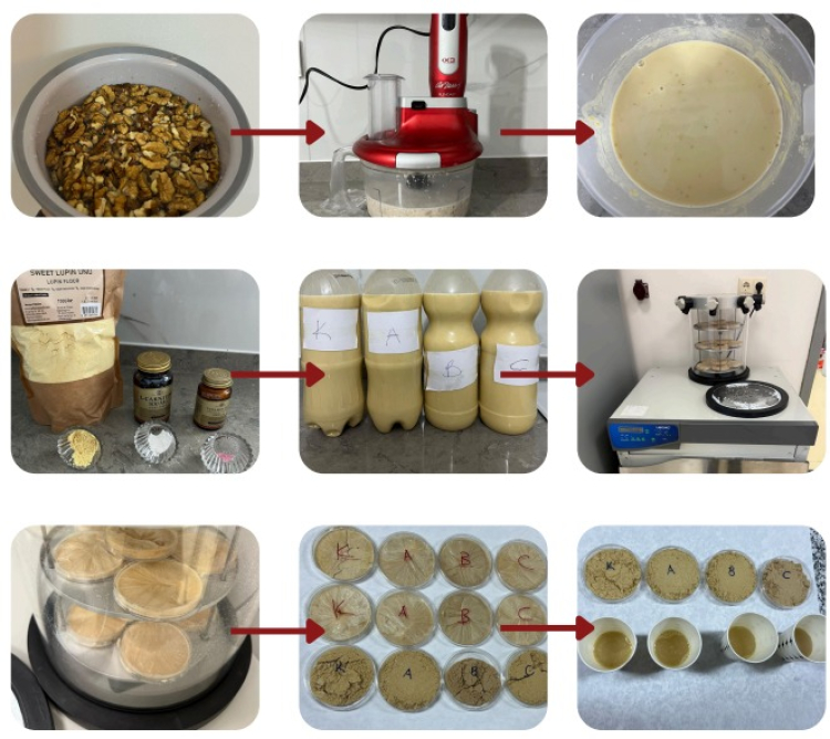 Araştırmada, Erzincan Karakaya bölgesinden temin edilen cevizler kullanılarak ceviz sütü üretildi. Ürün; Vitamin B12, L-Karnitin ve lupin (acı bakla) unu ile zenginleştirilerek liyofilizasyon (dondurarak kurutma) yöntemi uygulanmış ve kalite parametreleri detaylı şekilde analiz edilmiştir.
