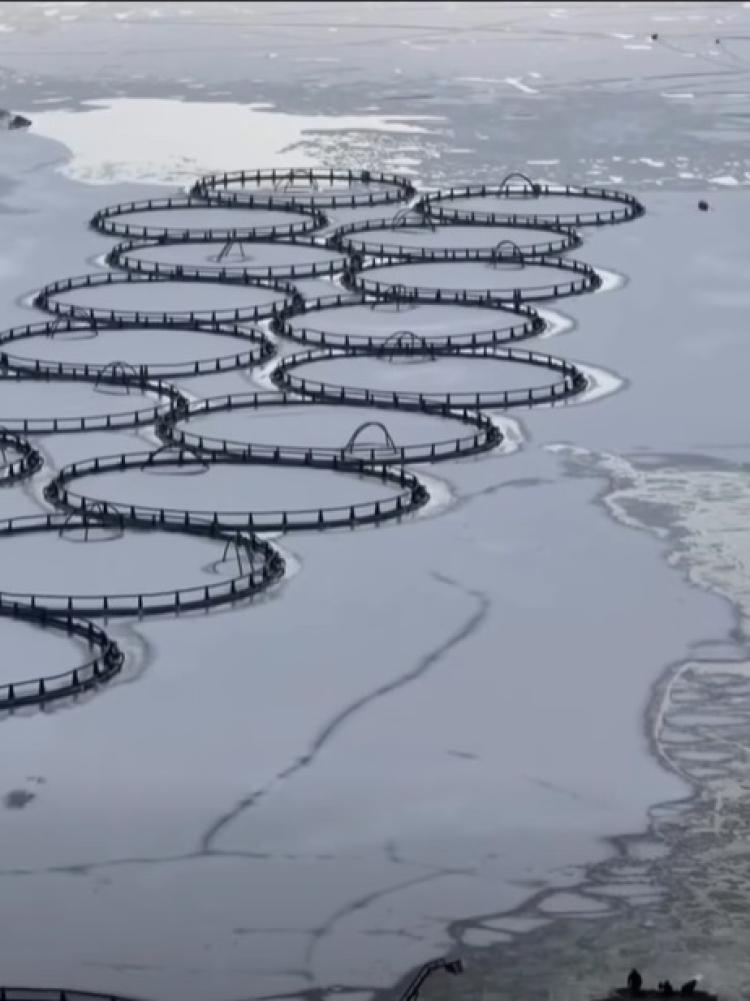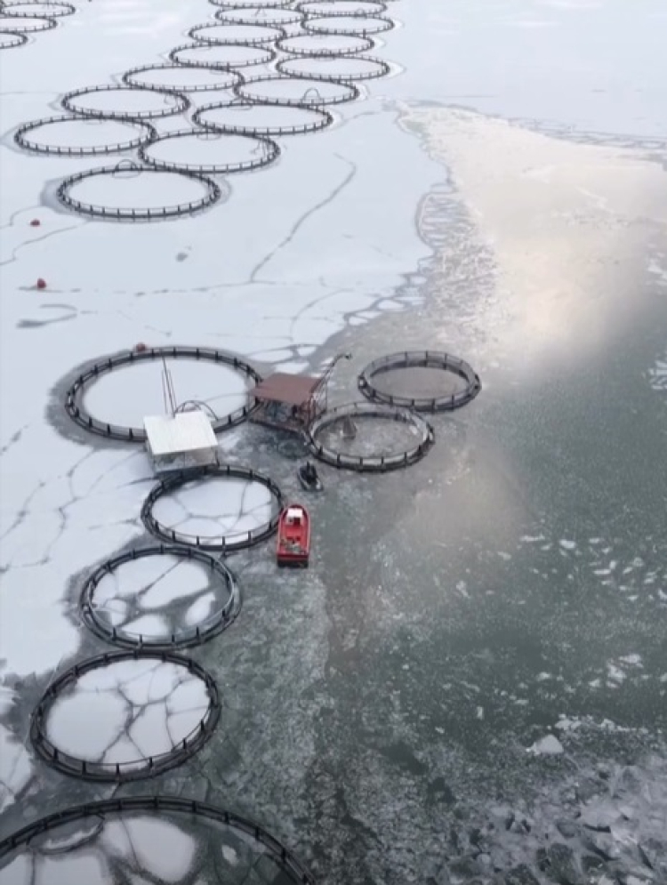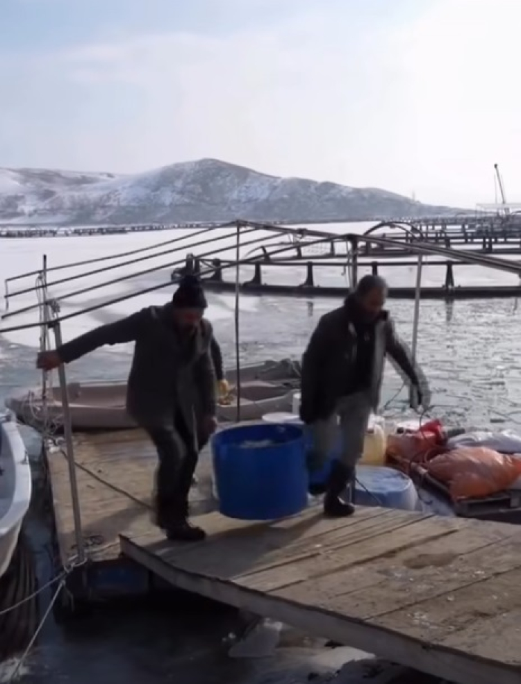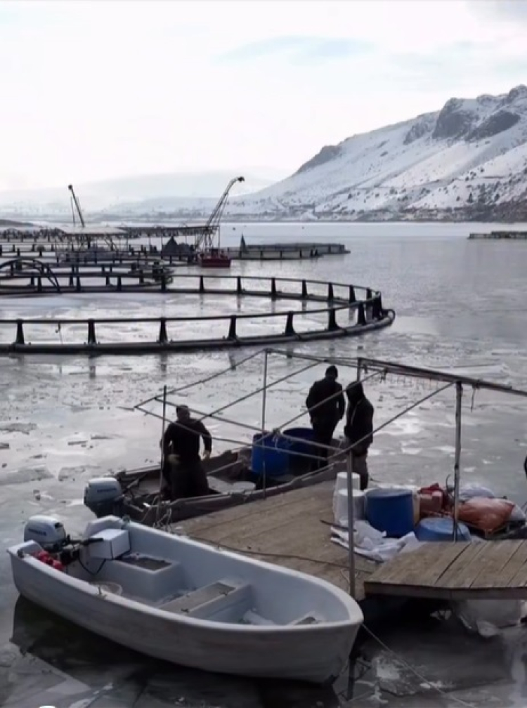 Kafes balıkçılığı yapan işletmeler, soğuk hava ve buzlanmaya rağmen faaliyetlerini sürdürebilmek için yoğun bir mücadele veriyor. İşletme çalışanları, sabahın erken saatlerinde göl yüzeyinde oluşan kalın buz tabakasını teknelerle kırarak kafeslerin bulunduğu alanlara ulaşıyor.