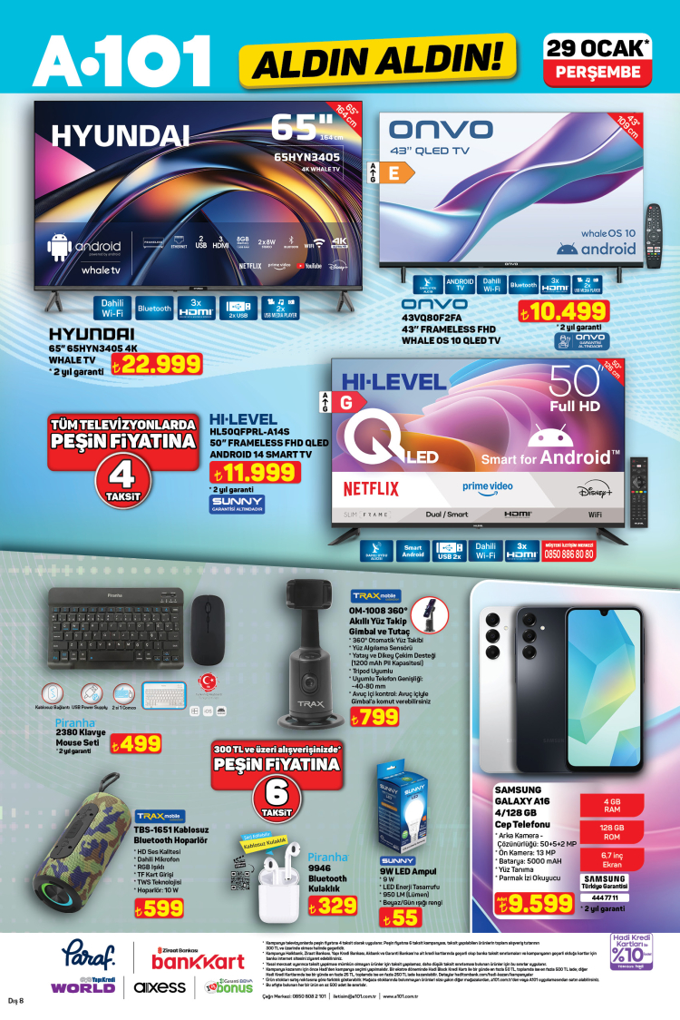 Teknoloji kategorisinde HYUNDAI 65” 4K Whale TV 22.999 TL, ONVO 43’’ Frameless QLED TV 10.499 TL ve HI-LEVEL 50” QLED Android Smart TV 11.999 TL fiyatlarıyla satışa çıkarken, tüm televizyonlarda peşin fiyatına 4 taksit uygulanacak. Ayrıca SAMSUNG Galaxy A16 4/128 GB Cep Telefonu 9.599 TL fiyatıyla tüketicileri bekliyor.