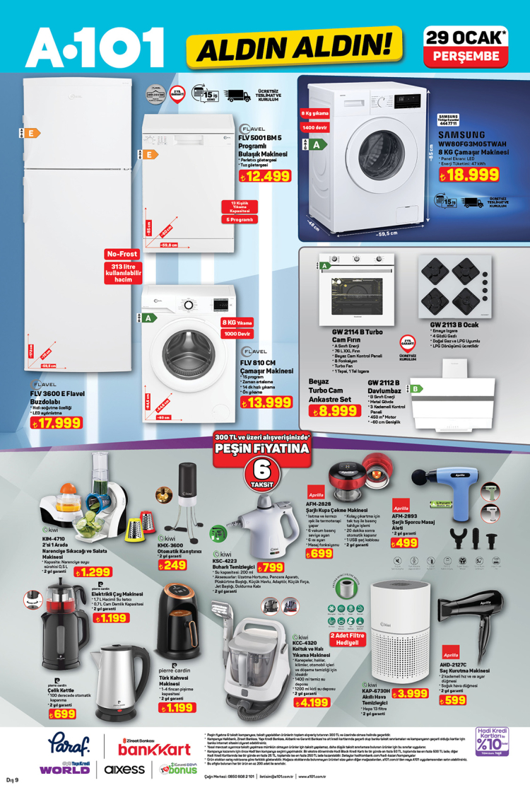 Beyaz eşya grubunda FLAVEL buzdolabı, çamaşır ve bulaşık makineleri, SAMSUNG 8 kg çamaşır makinesi ile GOODWEST ankastre set dikkat çekiyor. Bu kategoride 300 TL ve üzeri alışverişlerde peşin fiyatına 6 taksit imkânı sunuluyor.