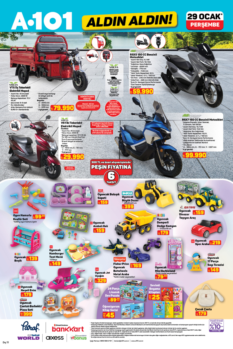 A101’in mobilite kategorisinde ise VOLTA VT5 Üç Tekerlekli Elektrikli Moped 79.990 TL, REVOLT RSX5 150 CC Benzinli Motosiklet 59.990 TL, VOLTA VS1 İki Tekerlekli Elektrikli Moped 29.990 TL ve REVOLT RSX7 150 CC Benzinli Motosiklet 99.990 TL fiyatlarıyla listeleniyor. Bu ürünlerde de peşin fiyatına 6 taksit seçeneği sunuluyor.