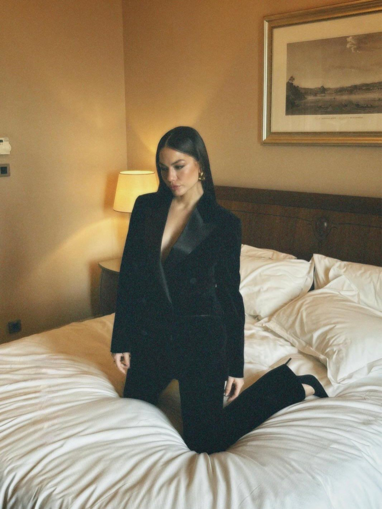 33 yaşındaki güzel oyuncu, yatağın üzerinde siyah takım elbisesiyle verdiği pozları takipçilerinin beğenisine sundu. Siyahın asaletini, kendi doğal ve enerjik tavrıyla birleştiren Özdemir, kısa sürede binlerce beğeni ve yorum aldı.