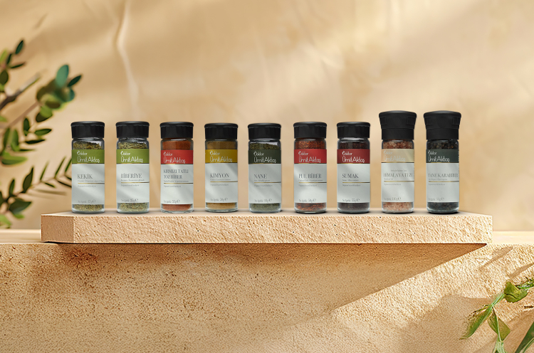 Dr. Ümit Aktaş güvencesi ile satışa sunulan baharat serisinde; himalaya tuzu, tane karabiber, sumak, pul biber, tatlı kırmızı toz biber, kimyon, biberiye, nane ve kekik olmak üzere dokuz çeşit yer alıyor.