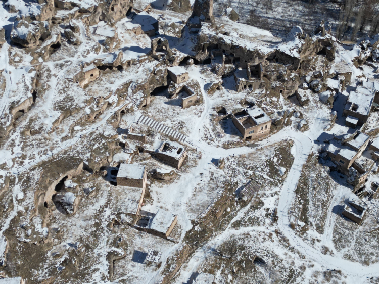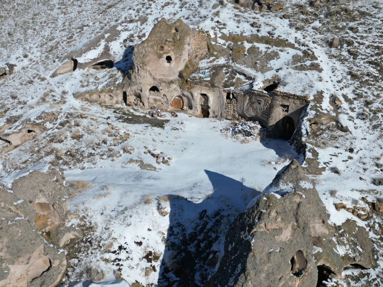 Kapadokya'nın girişi Soğanlı Vadisi karla kaplandı. Roma ve Bizans mirası kaya kiliselerinin beyaz örtü altındaki manzarası dronla görüntülendi.