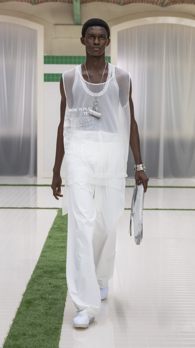 Duyusallık, tamamlanmamış siluetler ve vintage spor giyim esintileriyle yeniden harmanlanan atletik miras, bu sezonun zarif ama dinamik gardırobunun temelini oluşturuyor: transparan pololar; parlak deriden iddialı parçalar; üzerinde “Tennis for Everyone” yazılı sabahlığı andıran trençkotlar; yüksek teknoloji ipeksi dokulardan yapılmış hafif ve akışkan naylon parçalar – işlevsel estetiğe sahip kauçuk kaplamalı pamuk ve ıslak görünümlü naylonla buluşarak güçlü bir karşıtlık yaratıyor.